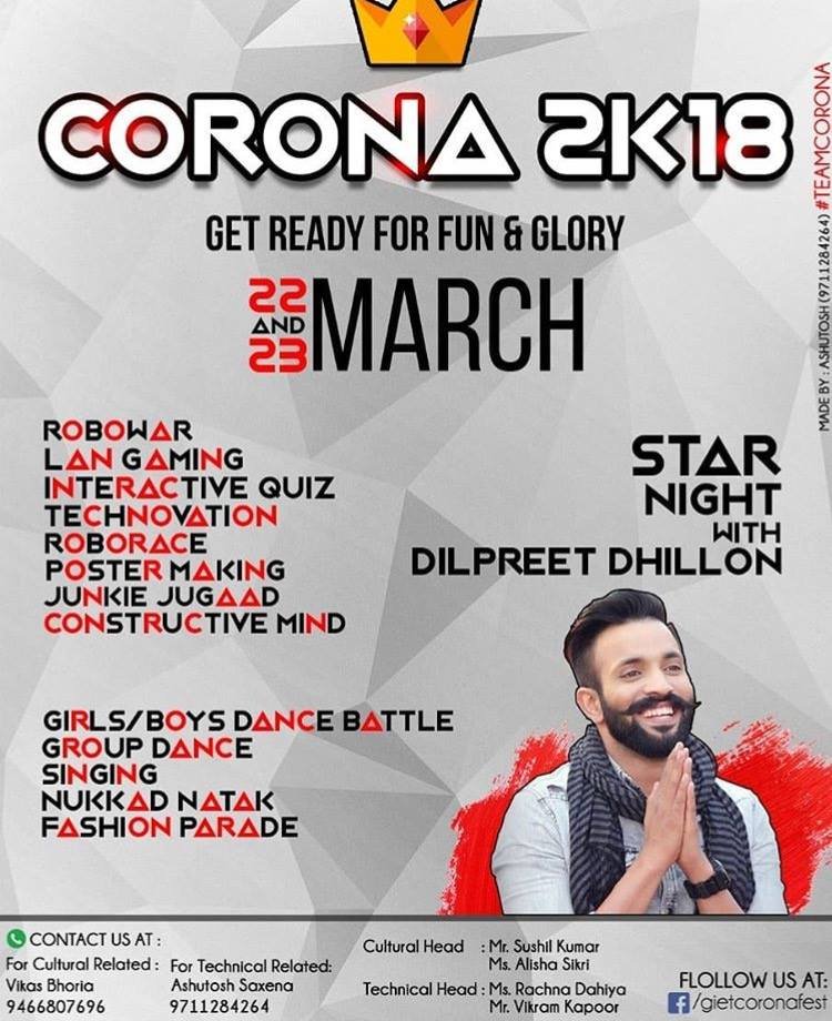 Punjabi Singer🎤 "DILPREET DHILLON" 🎤is all set to rock 🤘 GIET's Stage on 23rd March 2K18.So,do switch your😈 "Party Mode"😈 ON.#CORONA_2k18
