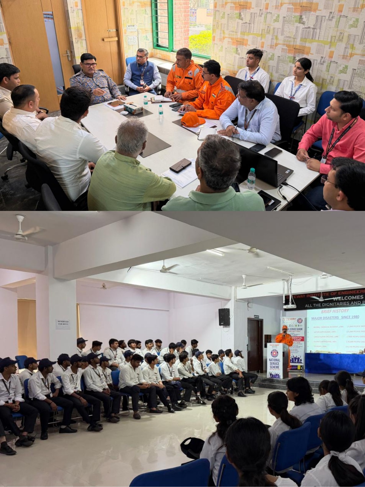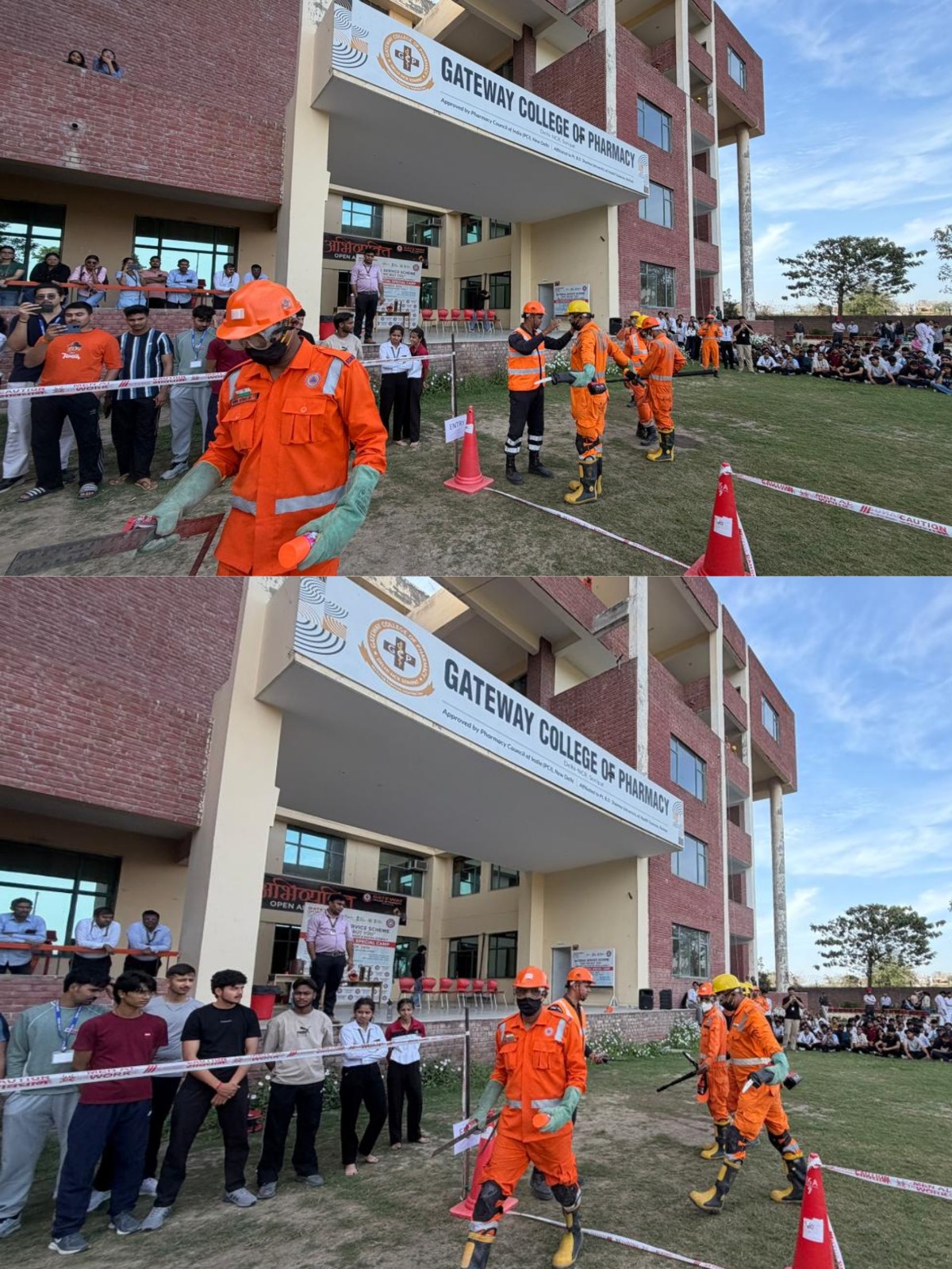 Gateway Education organized a Disaster Management Mock Drill during the 7-Day NSS Residential Special Camp in collaboration with the 16th Battalion of the National Disaster Response Force (NDRF). Around 70 NDRF personnel demonstrated rescue techniques for emergencies such as earthquakes, floods, and road accidents, providing valuable practical exposure to NSS volunteers. The session highlighted preparedness, coordination, and quick response during disasters. The program was graced by Colonel P. K. Dahiya and Mr. Vineet Kadyan, inspiring students to stay alert and contribute towards community service.