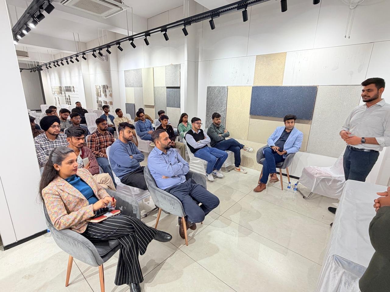 The session offered valuable exposure to contemporary flooring systems, including large-format tiles, porcelain slabs, and vitrified surfaces. Students gained practical insights into material properties, installation techniques, subfloor preparation, and selection criteria for commercial and office interiors, effectively bridging academic learning with real-world industry practices.