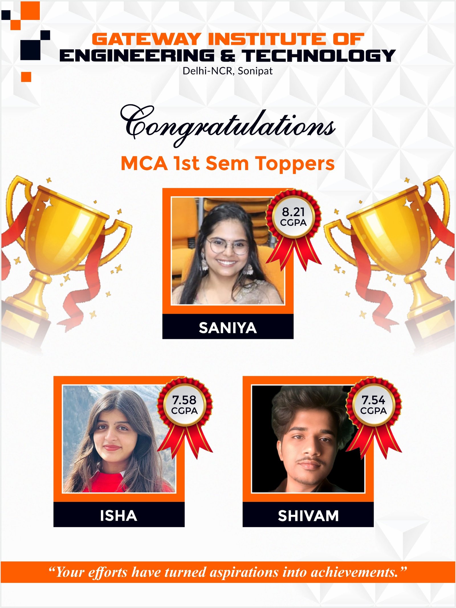 Gateway Institute of Engineering & Technology, Sonipat proudly congratulates its MCA students for their excellent academic performance in the 1st and 3rd semesters.